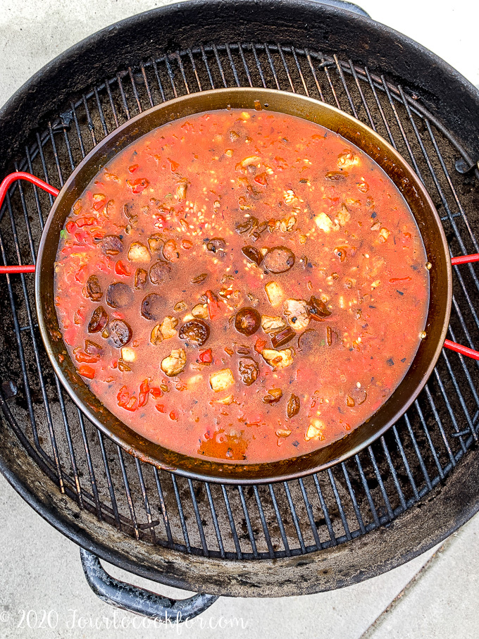 Once the grill is nice and hot, you can begin. Place your (seasoned) paella pan on the grill and add a bit of oil. Then start adding the meats to brown them up, starting first with the chorizo.