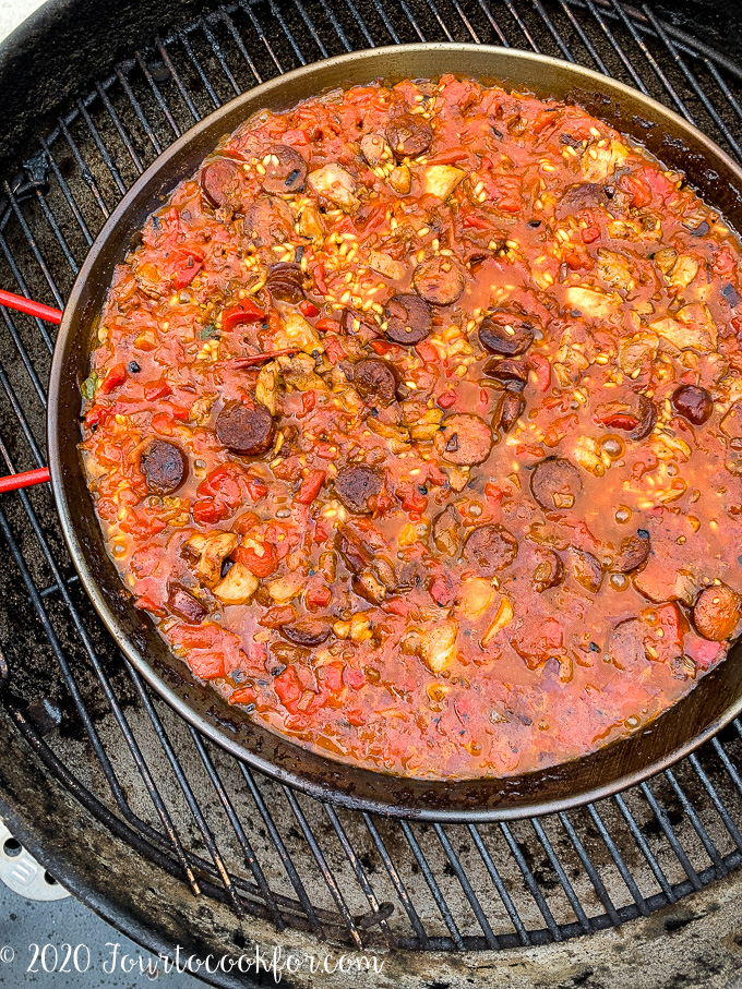 While I was doing the prep in the kitchen, Jeff fired up the grill. One of the reasons that I wanted to make this dish over the grill is that the pan is so huge, I was convinced that my stove top burners would not be able to cook the food evenly. I’m glad I did it outside. I think it added to the fun.
